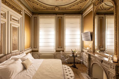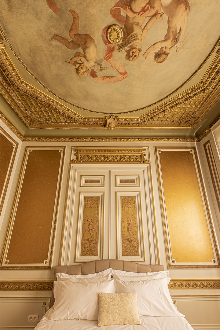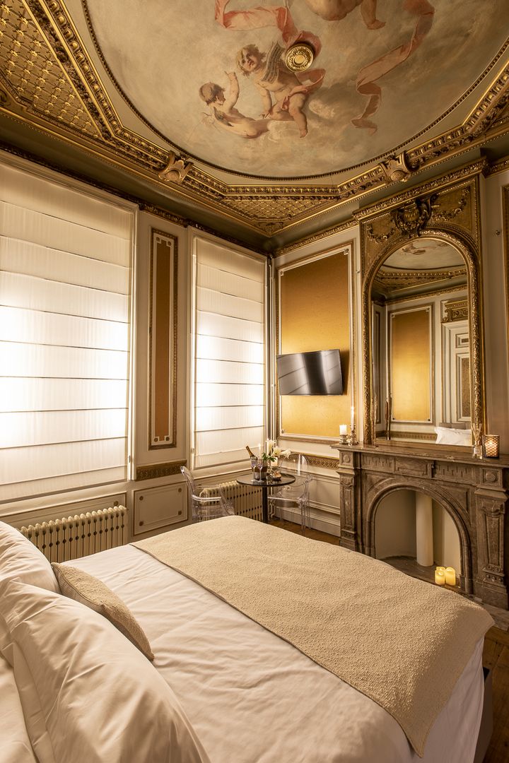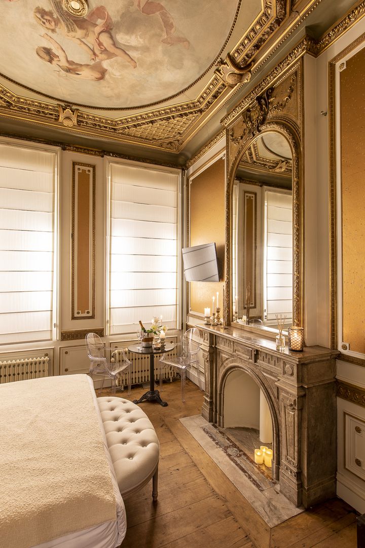 La suite L’Elégance doit son nom à son cadre hors du commun où la modernité se marie avec ses plafonds hauts, ses moulures et ses dorures qui rappellent un style d’un autre temps.